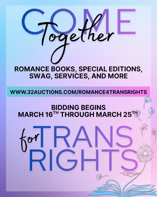 If you hadn’t heard a bunch of authors are getting together to raise money for Trans Rights by hosting an auction. There’s tons of amazing stuff to bid on and I hope you’ll join and help us raise funds. Details below. I’m donating audiobooks for The Roommate Situation and The Hookup Situation